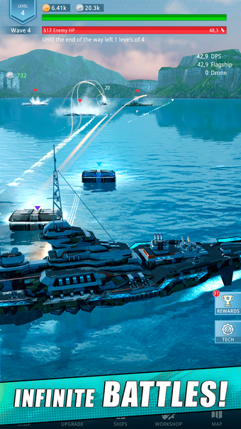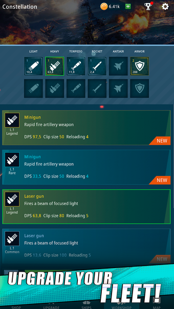- Kiedy pokonasz wroga, otrzymasz zasoby, które możesz wykorzystać do ulepszania swojego okrętu wojennego.